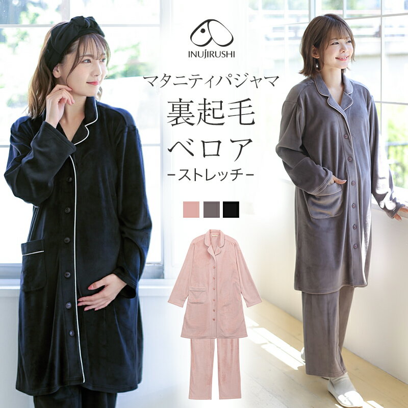 - 犬印本舗 マタニティパジャマ オープンカラー ストレッチベロア 長袖 裏起毛パジャマ 前開き M L | マタニティ 授...