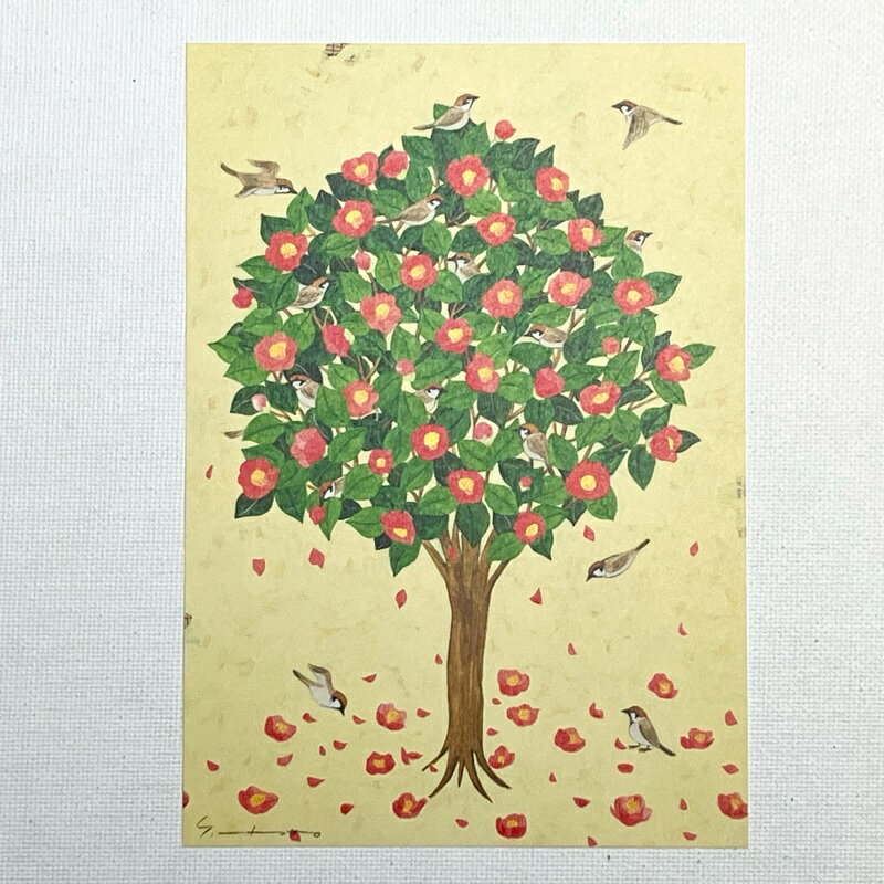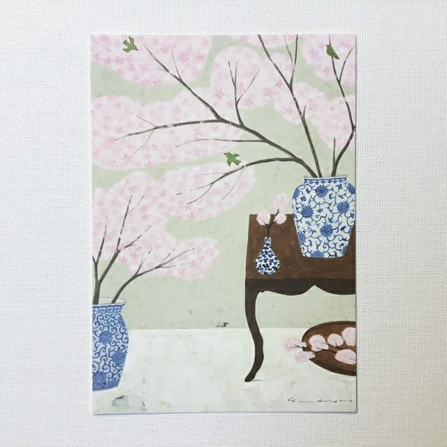 - Yoko Matsumoto マツモトヨーコ ポストカード 3羽の小鳥 サクラ 壺 ローテーブル トレー