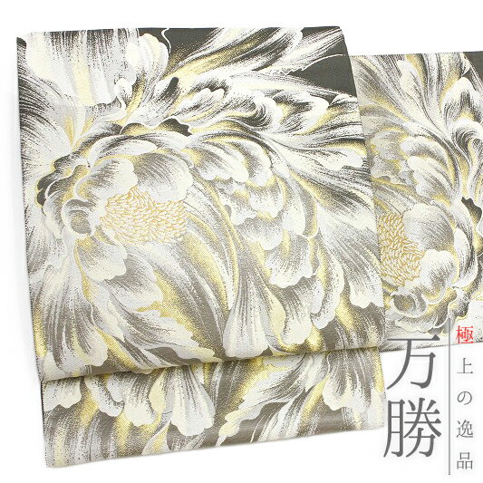 - 袋帯 織 織匠 万勝 正絹 グレー 牡丹 縫い箔 金糸 未仕立て 特選 礼装用 フォーマル 結婚式 着物 No.88-1324