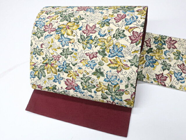 - 訳あり品 正絹紋意匠伊勢型染帯 仕立て上がり品 ワイン柄 染帯 オフ白地 ブドウ