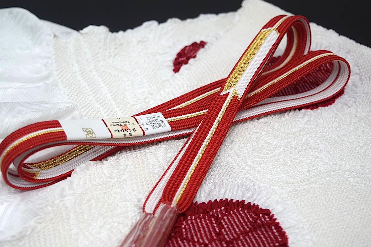 - 【京くみひも】【振袖用帯締め】【日本製】【手組み】【広幅 平組】正絹帯締め「矢羽根(赤×金×白)」