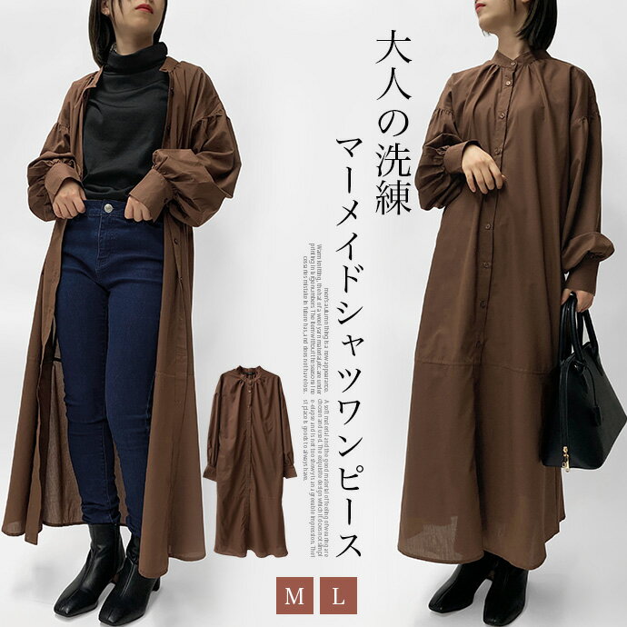 - 期間限定クーポンで2880円 シャツワンピース ワンピース レディース 長袖 春 秋 無地 バンドカラー マキシワンピー...