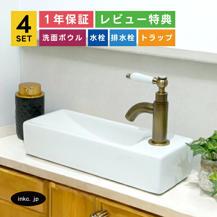 - 洗面ボウル+単水栓+排水栓+排水トラップ リフォーム diy 陶器 小さい 小さめ 置き型 壁付け 四角 スクエア レバー ...