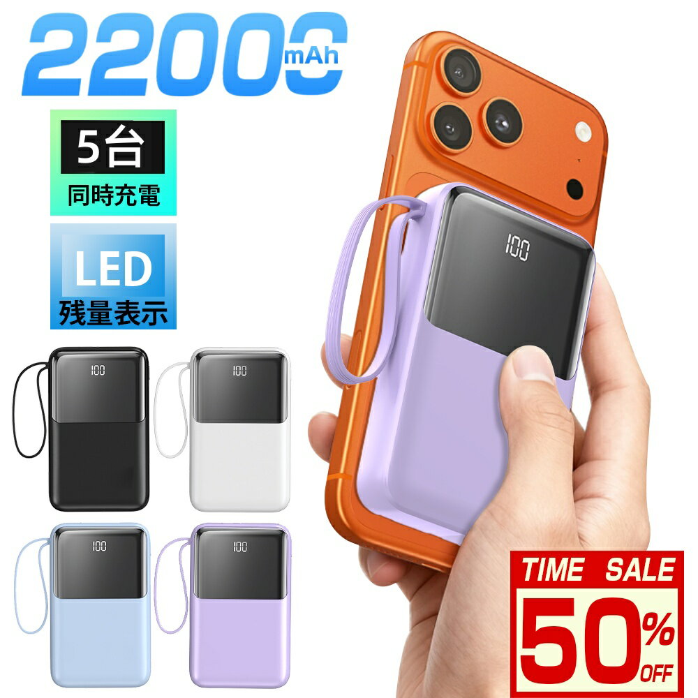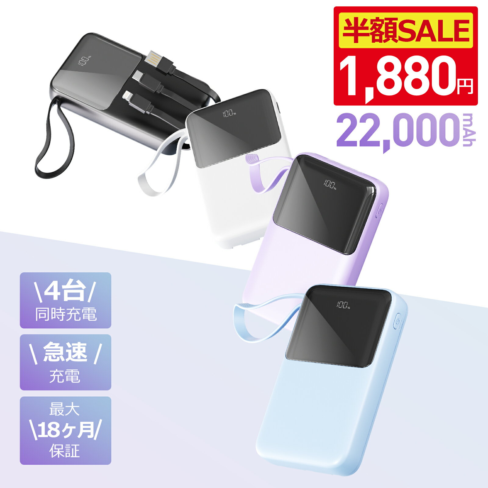 - 【最大18ヶ月保証&半額クーポンで1,880円】 モバイルバッテリー 22000mAh 大容量 小型 軽量 タイプC ケーブル内蔵 ...